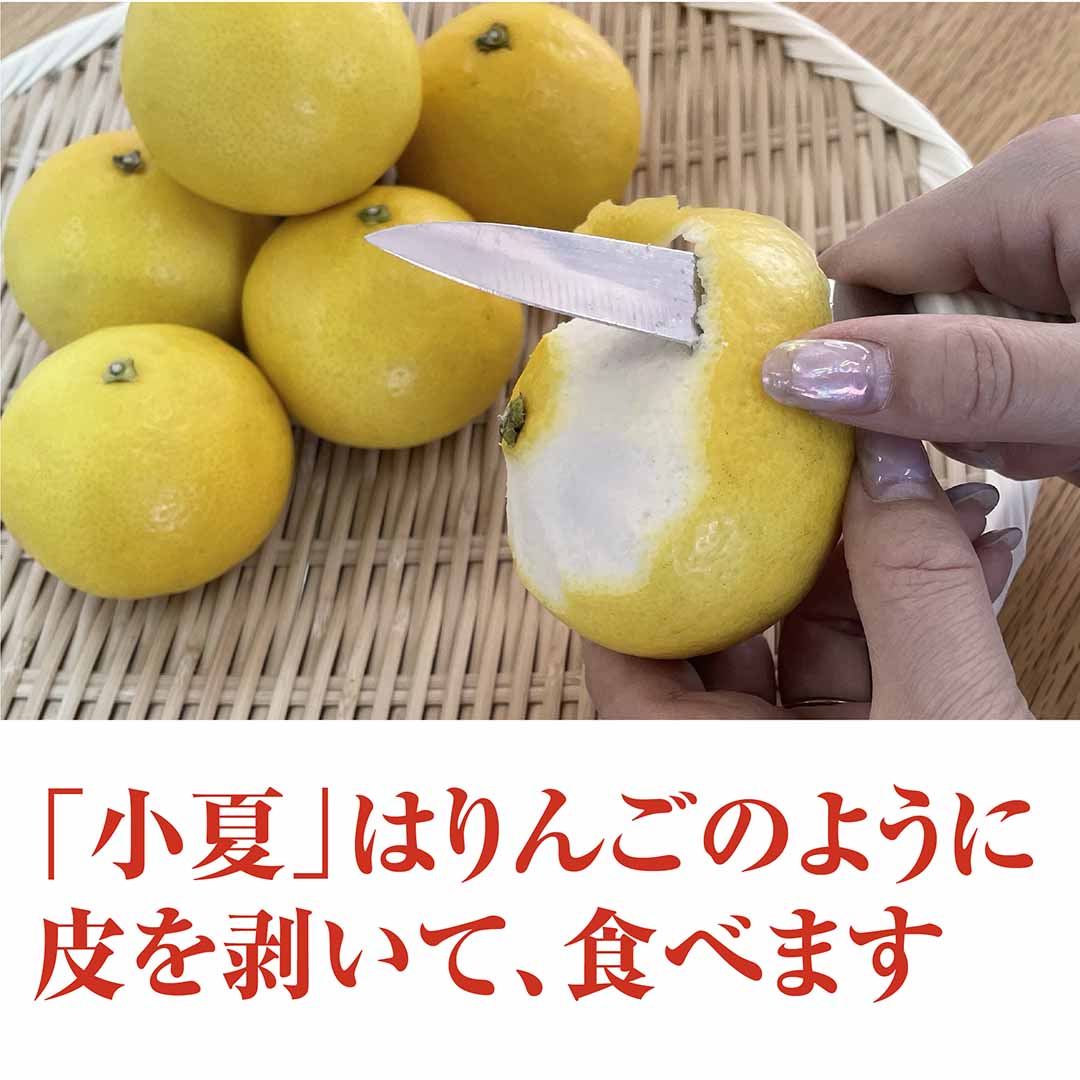 小夏の白い甘皮は肉厚でふかふかしており、りんごのように外皮をスルスルと剥き、白い甘皮と実を一緒に食べることで、小夏の爽やかな酸味に加味され上品な甘みを楽しむことができます。爽やかで上品な甘味 初夏の涼味をお楽しみください。